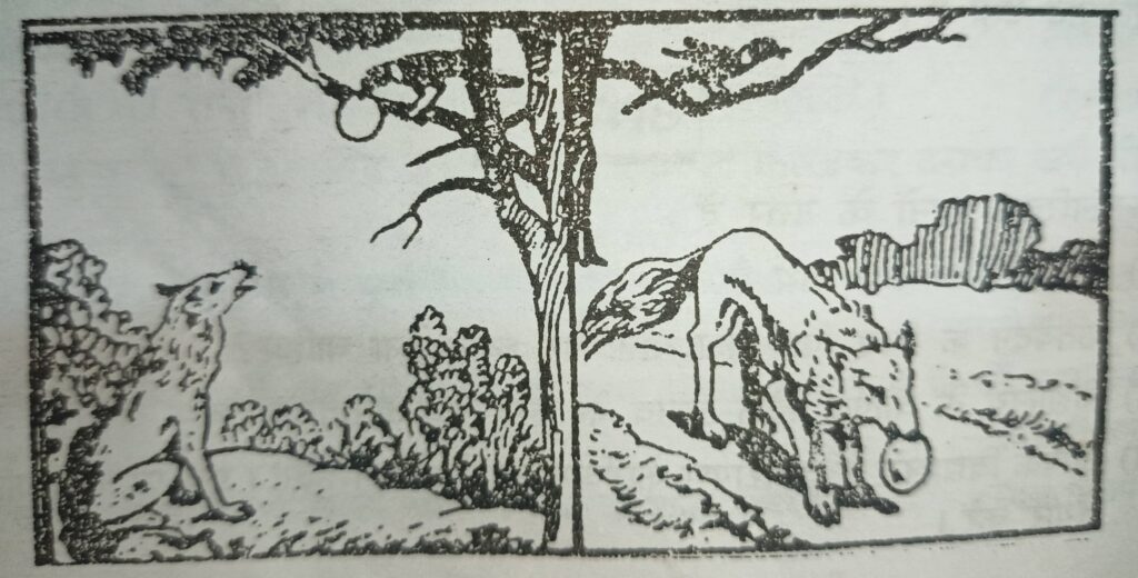 (ख) एक का पालतू बन्दर राजा का प्यार करना बन्दर की स्वामी भक्ति और सेवा – एक दिन राजा का सोना-बन्दर का पंखा झलना—एक मक्खी का बार बार नाक पर बैठना मक्खी पर तलवार चलाना मक्खी का उड़ जाना- राजा की नाक का कट जाना। “मूर्ख दोस्त से विद्वान दुश्मन भला ।”
