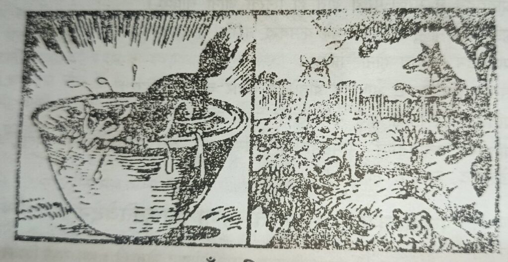 (क) एक कौआ —पानी की खोज में भटकना— तीव्र गर्मी— एक घड़े के पास पहुँचना-घड़े के पेंदे में पानी कौए की चोंच का पानी तक नहीं पहुँचना — कौए का सोचना — घड़े में कंकड़ डालना – पानी का ऊपर उठना-पानी पीकर प्यास बुझाना। “बुद्धिबल से कार्य सिद्धि । ”
